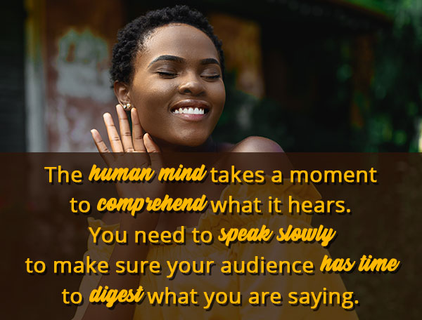 Home | The human mind takes a moment to comprehend what it hears. You need to speak slowly to make sure your audience has time to digest what you are saying.